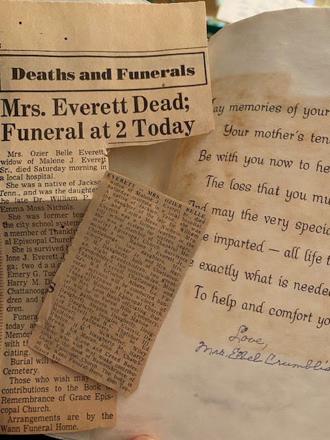 The cards themselves presented expressions of kindness in respectful tones. There were several senders who wrote about their regret in having missed the funeral, and more than a few thoughtfully enclosed a clipping of Nannie's newspaper obituary.